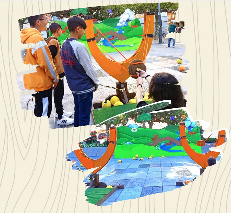 Un escenario de 6 metros de largo x 3,20 de alto x 2,5 de ancho, sobre el que se lanzan, desde dos plataformas con tirachinas gigantes situadas a 7 metros, bolas de polen con un objetivo muy claro: derribar a las perversas hormigas que mantienen cautiva a nuestra querida Abeja Reina.